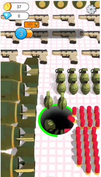3、观卡通人物走路画面,点底部一排武器图标中任意一个,如手枪,或等上方进度条变化,应对黑色洞的挑战。